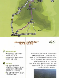 그외 등산 지도 & 교통140 [완도] 청산도 보적산 대봉산 대선산 매봉산 지도. 교통... 슬로시티길 청산도는 전남 완도에서 19.2km 떨어진 다도해 최남단섬으로 완도항에서 뱃길로 50분 거리에 위치해 있습니다. 자연경관이 유난히 아름다워 예로부터 청산여수(靑山麗水) 또는 신선들이 노닐 정도로 아름답다하여 선산(仙山), 선원(仙源)이라 부르기도 했습니다. 푸른 바다, 푸른 산, 구들장.. 2017. 3. 23. [신안] 가거도 독실산 지도. 교통...민박/식당 [출처: 신안군 홈피]국토의 최서남단에 위치(동경 125°7′, 북위 34°4′)한 가거도는 목포에서 남서쪽으로 145km의 거리에 있다. 신안군에서 가장 높은 독실산(639m)을 중심으로 서남쪽으로 뻗어있는 가거도는 산세가 높고 섬 전체가 절벽으로 형성 되어 웅장하고 기괴한 절경과 함께 남성적인 미를 풍기며, 면적은 9.18㎢, 해안선 길이는 22㎞에 이른다. 길쭉한 해안선과 가파른 해안절벽 위로 항상 구름을 머금고 바다 위에 둥둥 떠 있는듯한 독실산의 모습은 무어라 표현할 수 없는 신비감을 안겨다 준다. 다른 명칭인 '소흑산도'란 이름은 일제시대 때의 명칭이며, 옛날에는 '아름다운 섬'이라는 뜻의 '가가도'(嘉佳島, 可佳島)로 불리다가, '가히 살만한 섬'이란 뜻의 '可居島'로 불리게 된 것은 189.. 2014. 2. 17. [인천] 무의도 국사봉. 호룡곡산 지도.교통...소무의도바다누리길. 하나개해수욕장. 실미도 무의도는 인천국제공항의 남쪽에 위치한 잠진도 선착장에서 1.5km 떨어진 조그만 섬이다. 북쪽부터 당산(124m), 국사봉(236m), 호룡곡산(245m)의 나지막한 봉우리들로 이어져 있다. 이 곳은 고래바위, 마당바위, 부처바위 등 괴암절벽의 비경과 절경을 감상할 수 있으며 산의 높이도 높지 않고, 산행거리도 길지 않아서 등산초심자나 어린이도 충분히 걸을 수 있다. 또한 바다와 함께 하는 등산코스라서 빽빽한 소나무와 숲을 헤치고 나면 하나개, 큰무리 해수욕장 등의 시원한 그림이 펼쳐진다. 주변의 작은 섬들과 해변 양쪽의 국사봉, 호룡곡산이 마치 병풍처럼 둘러져 있어 아름답기 그지없다. 산을 오르다 뒤돌아 보면 승봉도, 자월도 등 주변의 섬들이 바다와 어우려져 한눈에 들어오며 이웃섬 영종도 인천국제공항의.. 2014. 2. 9. [구례] 오산 등주리봉 지도. 교통...사성암 문척면 죽마리에 위치해 있는 해발 531m의 호젓한 산으로 자라모양을 하고 있으며, 정상에 오르면 굽이치며 흐르는 섬진강과 구례읍, 지리산 연봉들을 볼 수 있습니다. 정상에는 사성암 암자를 중심으로 풍월대, 망풍대, 배석대, 낙조대, 신선대 등 오산이 자랑하는 12비경이 있습니다. ‘.. 2014. 2. 8. [횡성] 덕고산 지도.교통... ◈ 교통: 원주역/시외터미널->41번버스(06:00~21:50/일33회)->다리목/교항리 횡성터미널옆5거리 축협앞->버스(08:10~18:00/일5회)->송호대학 ※자료출처: 횡성군청 2013. 12. 25. [횡성] 매봉산 지도.교통... 풍수원 성당 ◈ 교통: 원주역[횡성터미널 경유]->서원/창촌행 버스[2-8번:06:00/06:40/08:20/09:50/11:00/13:20/15:10/16:10/17:50]->서원면사무소 원주역->서원/창촌행 버스 54번[05:50/18:00]->터미널옆 롯데마트경유->서원면사무소 ※자료출처: 횡성군청 2013. 12. 25. [횡성] 발교산 병무산 지도. 교통... ◈ 교통 원주 /(횡성터미널경유) ->2-5번버스[18:00]-봉명리종점/춘당분교 원주역(횡성터미널경유)->2-5번버스[09:20]->봉명리종점/춘당분교 홍천터미널->40번버스[서석행.08:40~17:20/일3회]->물골고개(대학산코스) ↘ 54-2/55번버스 각1회(06:20.11:30)->물골종점(대학산코스) ◈횡성군청※자료출처: 횡성군청- 클릭시 커짐 2013. 12. 23. [화천] 해산 지도.교통...비수구미계곡. 해산령 ◈화천군청출처: 화천군청 2013. 12. 22. [진도] 접도 남망산 지도.교통... 커다란 바위가 작은 바위를 잉태한 듯한 형상의 아기 밴 바위에서 바라보는 일출은 새벽녘 잔잔한 바다위로 태양의 미광이 물길을 따라서 바라보는 이의 가슴에 이르러서는 마치 활화산에서 분출되는 마그마의 기운이 느껴진다. 남망산은 해발 160미터 가량의 부담스럽지 않는 높이로 등산 초보자나 최적의 가족단위 등반 코스다.산길 따라 펼쳐지는 동백, 후박, 상록수와 잡목은 수목원을 방불케하며 중간 중간 자리한 수백 년 된 거목은 경이로움마저 느끼게 한다. 작은 고개를 하나씩 넘을 때 마다 서귀바위, 병풍바위, 아홉 봉우리, 낭 기미, 말똥바위, 솔섬바위등 다양한 기암절벽을 만나게 된다.(웰빙등산 소요시간 약 3시간) 현재에도 접도는 낚시광들이 즐겨찾는 곳으로 자리매김 되어 있다.특히 수품 항 앞에 위치한 작은 무.. 2013. 11. 1. [여수] 금오도 비렁길과 매봉산(대부산) 지도. 교통... 해안단구가 층층이 겹쳐지는 광경이 눈에 들어온다. 절벽아래 떠다니는 작은 배 한 척이 한가로워 보인다. 푸른 바다와 쏟아지는 햇빛이 강렬하게 느껴진다. 길옆 바위에 붙어있는 콩란들이 앙증맞게 통통하게 솟아있다. 이 모든 아름다운 광경은 금오도 생태탐방로 '비렁길'에서 볼 수 .. 2013. 8. 31. [성주.칠곡] 영암산 선석산 비룡산 지도.교통...세종대왕 왕자 태실 바위가 없고, 등성이가 넓고 편평하여 밭을 일구어도 될 정도로 흙산이며, 숲이 좋고 비탈이 가파르지 않아 산길이 산책길처럼 느껴진다. 일명 